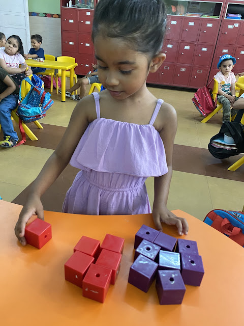 The concept of addition by counting on was given to the learners of Pre Primary through coloured blocks. 2 different colour blocks were kept in front of them and they were asked to tell the total. The emphasis was given on counting on. For example- 8 purple block and 6 red blocks were kept. Student will first count 8 purple blocks and then will further count on the next 6 red blocks.